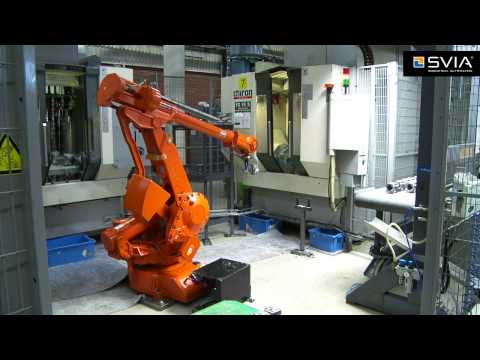 A particularly nice video showing an industrial robot arm moving cylinder heads to 2 different CNC machines. The arm changes end effectors in the course of moving and palletized the parts. You can imagine that the central arm may have recently replaced a human operator, a textbook case of rationalizing that "robots don't take breaks or call in sick".
