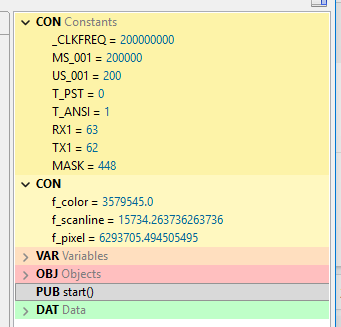 Darn. I was really hoping the color for sections and highlights could be found in the .spin-tools configuration file. I have a very big P1 project with 3000+ lines and would love if the make the line maker in the outline view more obvious. Had I found the colors in the configuration file I was hoping to go from this: