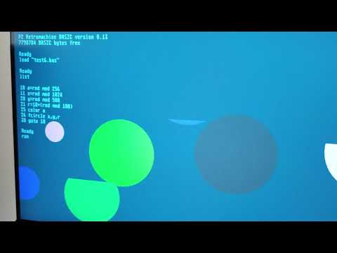 Still very early pre-alpha without the most important language features. Recognized keywords in 0.13 are: cls, new, plot, draw, print, fcircle,color,list, run,goto (limited), csave, save, load, rnd. Also arithmetic, div, mod, shl, shr and ^