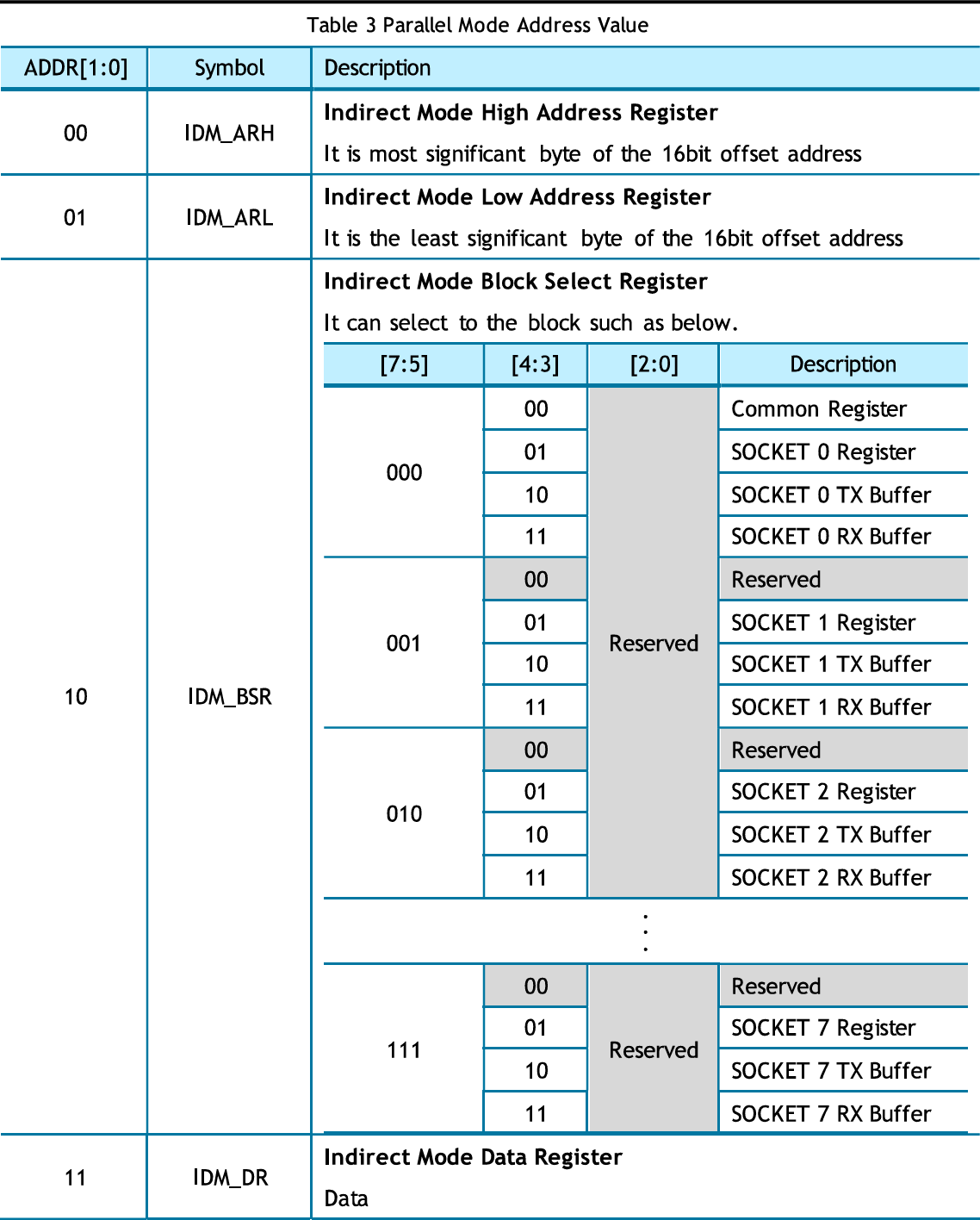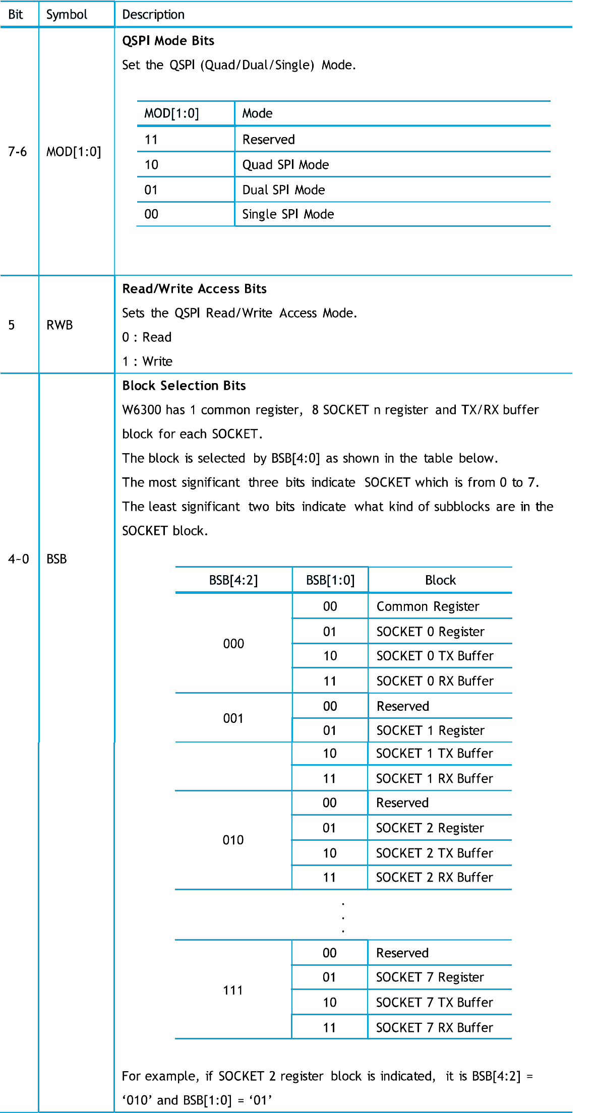 I wanted to capture the differences I have found between the W6100 and W6300. So far, the only issues I have found is the value difference of the SPI block selection. The parallel block select is the same between the chips, with reserved bits. Below are from the W6300 datasheet.