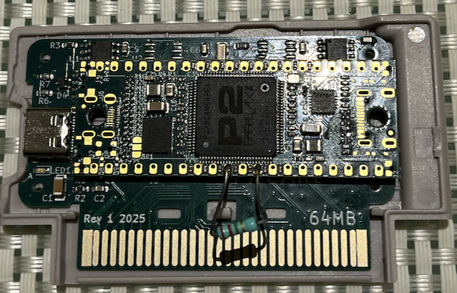 Still need to test out flash and then the P2 IO, the 32MB of PSRAM and my SD mode SD card circuit, plus the GPi Case 2W's VGA/audio/game controller interface and also see if it works up at 340MHz and the thermals. If some heat transfer is needed there is room for a heatsink plate above the P2. We are sort of hoping with the large number of layers on his board and through to my own board once solder nuts are attached will help spread the heat from the P2 and transfer some away.