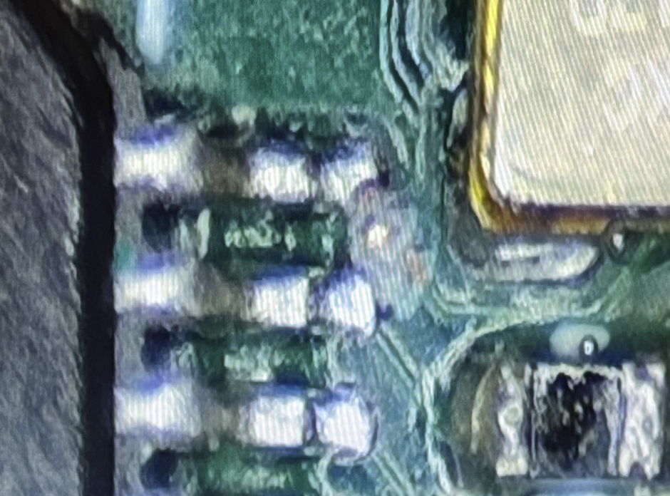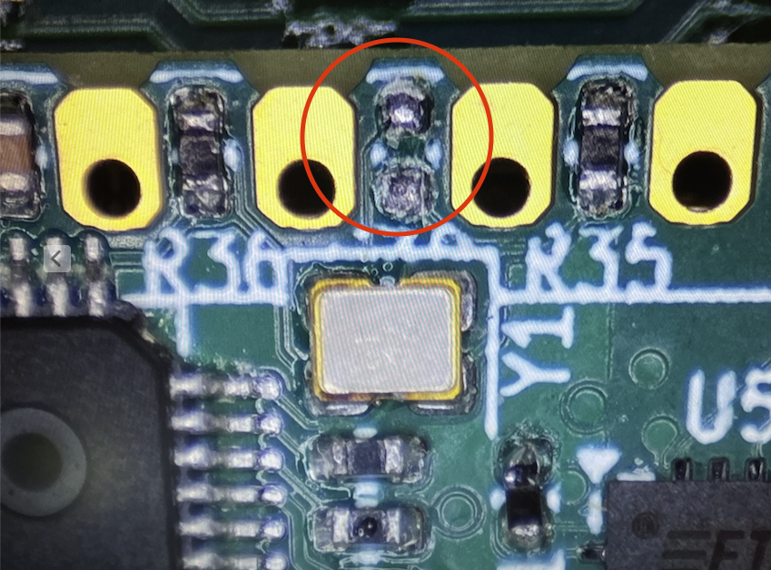 @Tubular I do see what looks to be a missing cap in the close up microscope image below. This cap is in parallel with the bypass cap for VIO28_31 on P2 pin number 47. Maybe the oscillator would work better with the extra one fitted? Perhaps with the oscillator's current draw and HF bouncing signals the existing 2.2uF bypass cap is insufficient? I buzzed out the wiring on a spare board and follow the paths, then buzzed out the real board and it all appears to connect ok through those zero ohm resistors. Hopefully the footprint for this particular type of oscillator we got is correct and we don't feed the signal into XOUT instead of XIN or something. I'll also try to probe which P2 pin(s) see the 64MHz soon. The XOUT probably has a replica of the signal though if the P2's PLL clock mode is enabled - will need to keep that off too when probing.