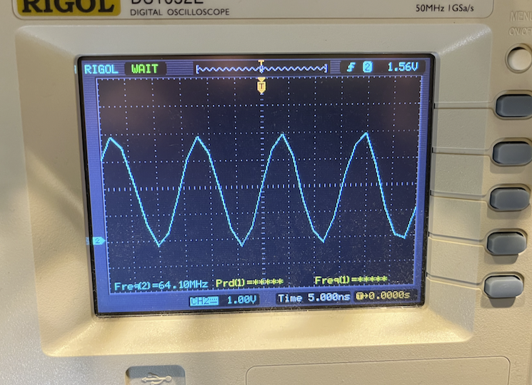 Just probed the XIN pin on the P2 and it does get the signal like we saw yesterday, nothing is coming out the XOUT pin. This was with the P2 idling after voltage initially applied - i.e. waiting on serial boot code so running in RCFAST mode. My crappy old bandwidth limited Rigol scope shows it around 64MHz. Overshoots up to 4V or so. Hopefully the P2 can handle that.