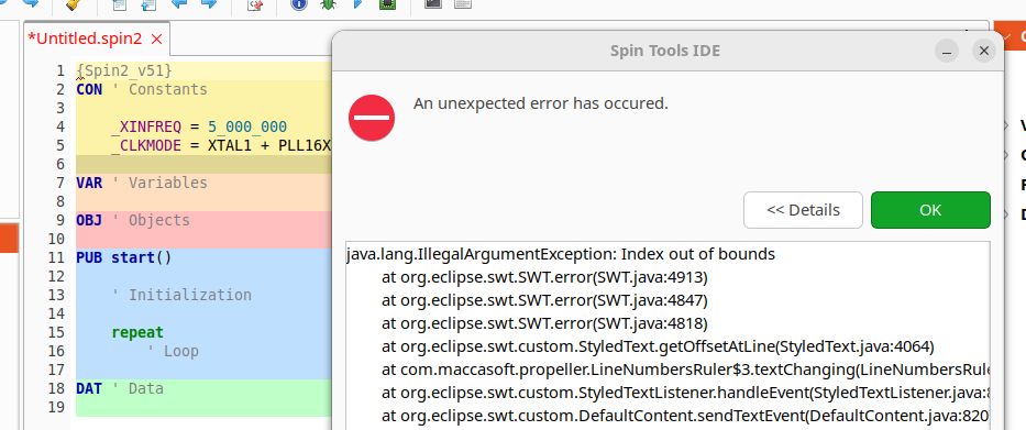 In the example above the error is caused by the missing XTAL1 and PLL16X (this is a spin2 source, these constants are really missing) but not reported correctly (the red squiggle in the first { character), when I hit enter to add a new line the error pops-up.
