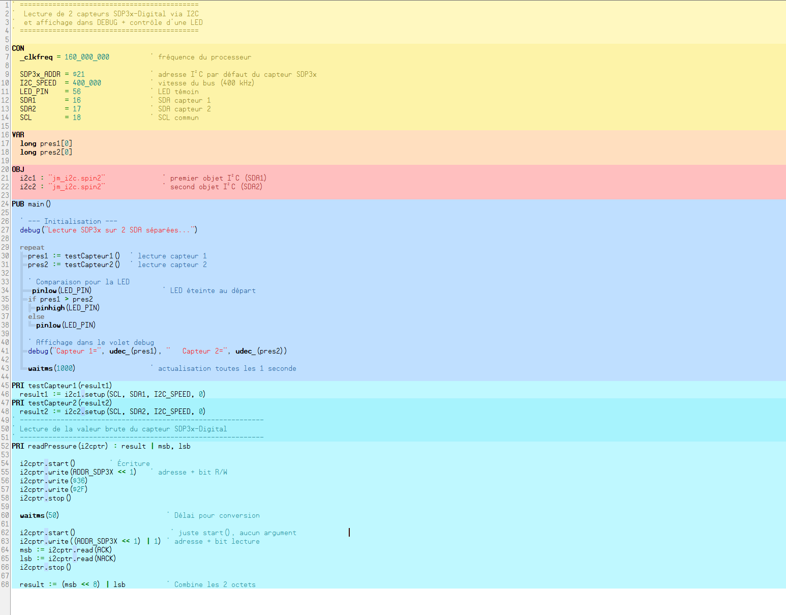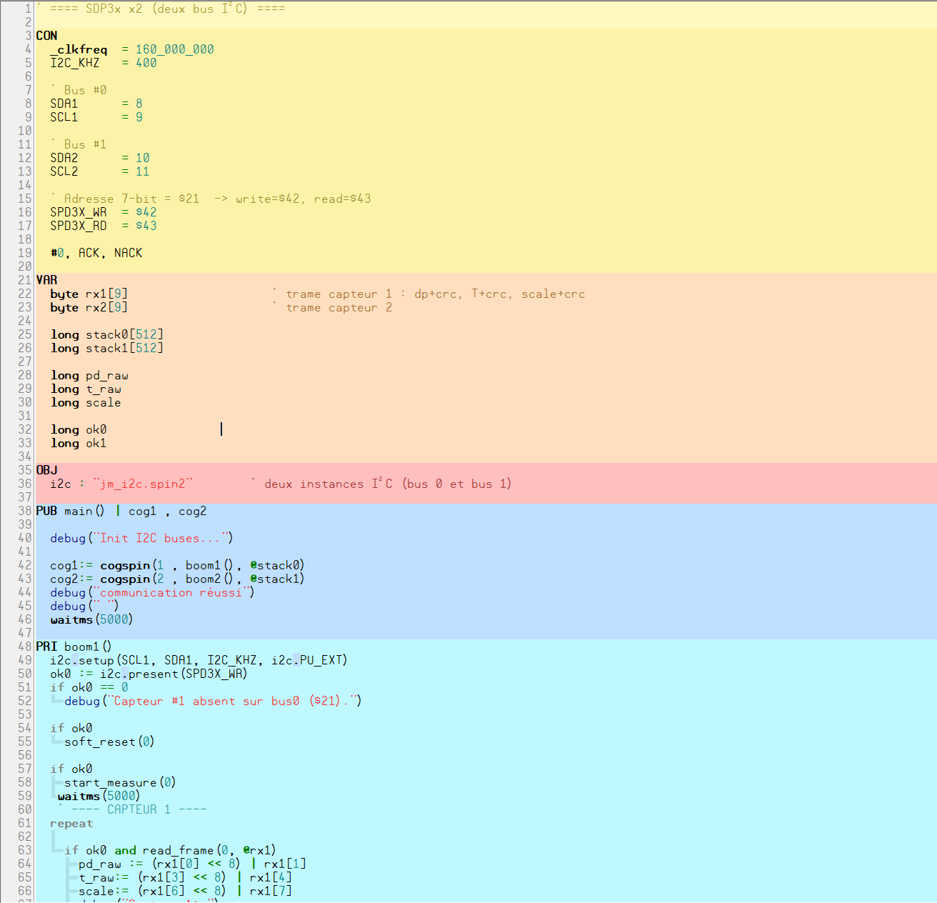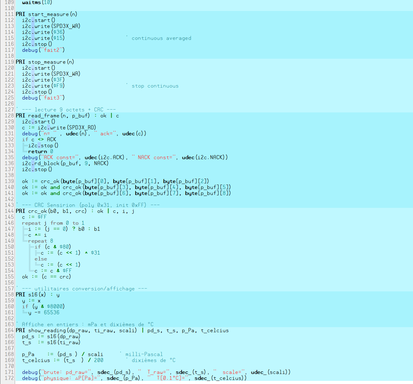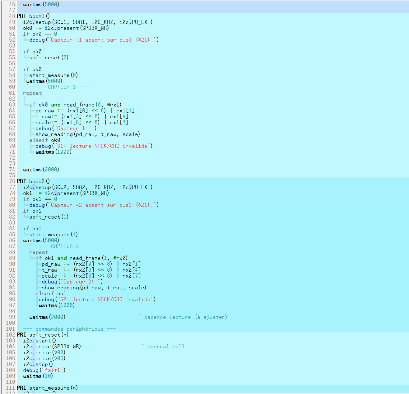 if ok0 and read_frame(0, @rx1) pd_raw := (rx1[0] << 8) | rx1[1] t_raw:= (rx1[3] << 8) | rx1[4] scale:= (rx1[6] << 8) | rx1[7] debug("Capteur 1: ") show_reading(pd_raw, t_raw, scale) elseif ok0 debug("S1: lecture NACK/CRC invalide") waitms(1000)waitms(2000)