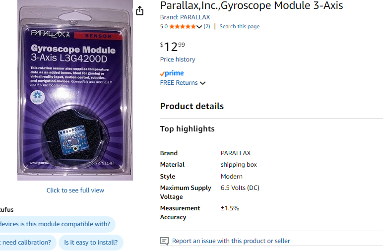 I am planning to use the Parallax Inc. 3-axis gyroscope for the balance system