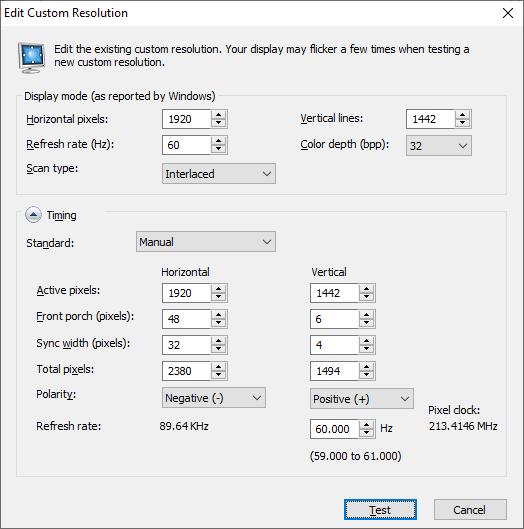What I did was use the existing resolutions as a guide. The basic idea is to convert one of those to be interlaced so the whole process is vetted. You know before you start tweaking that an interlaced display is possible.