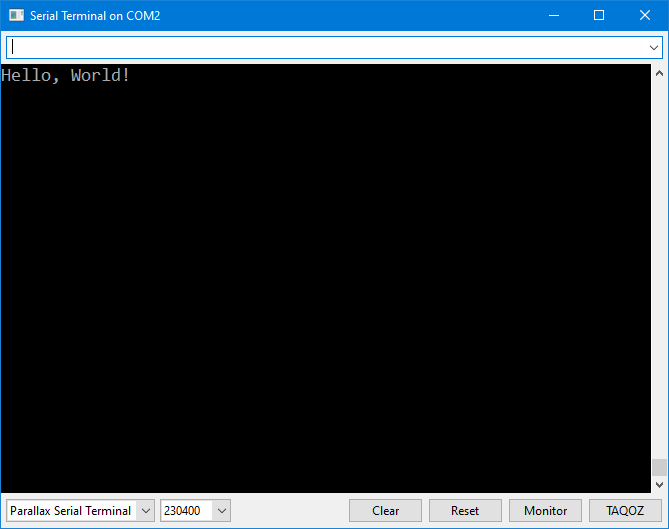 Note that at the top of the window, just under the title bar, there is an input field. In PST this is always present, and PST always takes a keypress and immediately sends it to the Propeller.