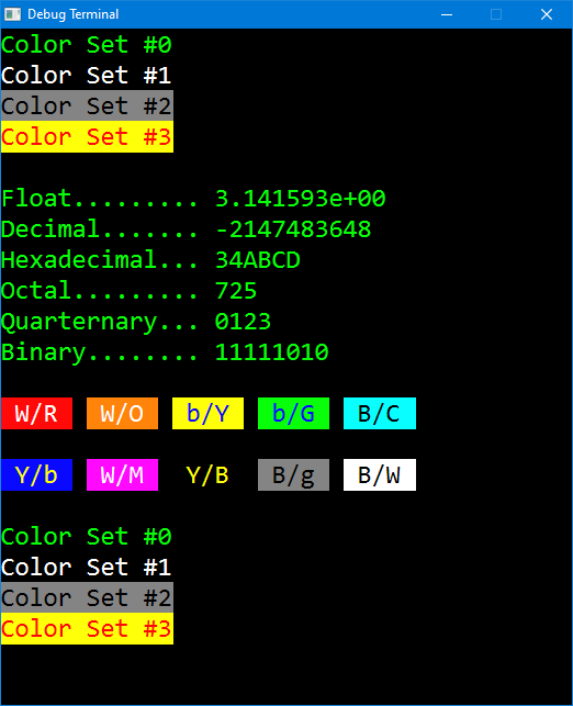 A while back Ray Allen expressed an interest in a DEBUG Terminal object and I needed one for a work project. It took a while to get PNut and Spin Tools synced, but now they are and the DEBUG Terminal window allows arbiraty color changes (as well as the original four sets) , which is something I wanted for my project. The demo looks like this.