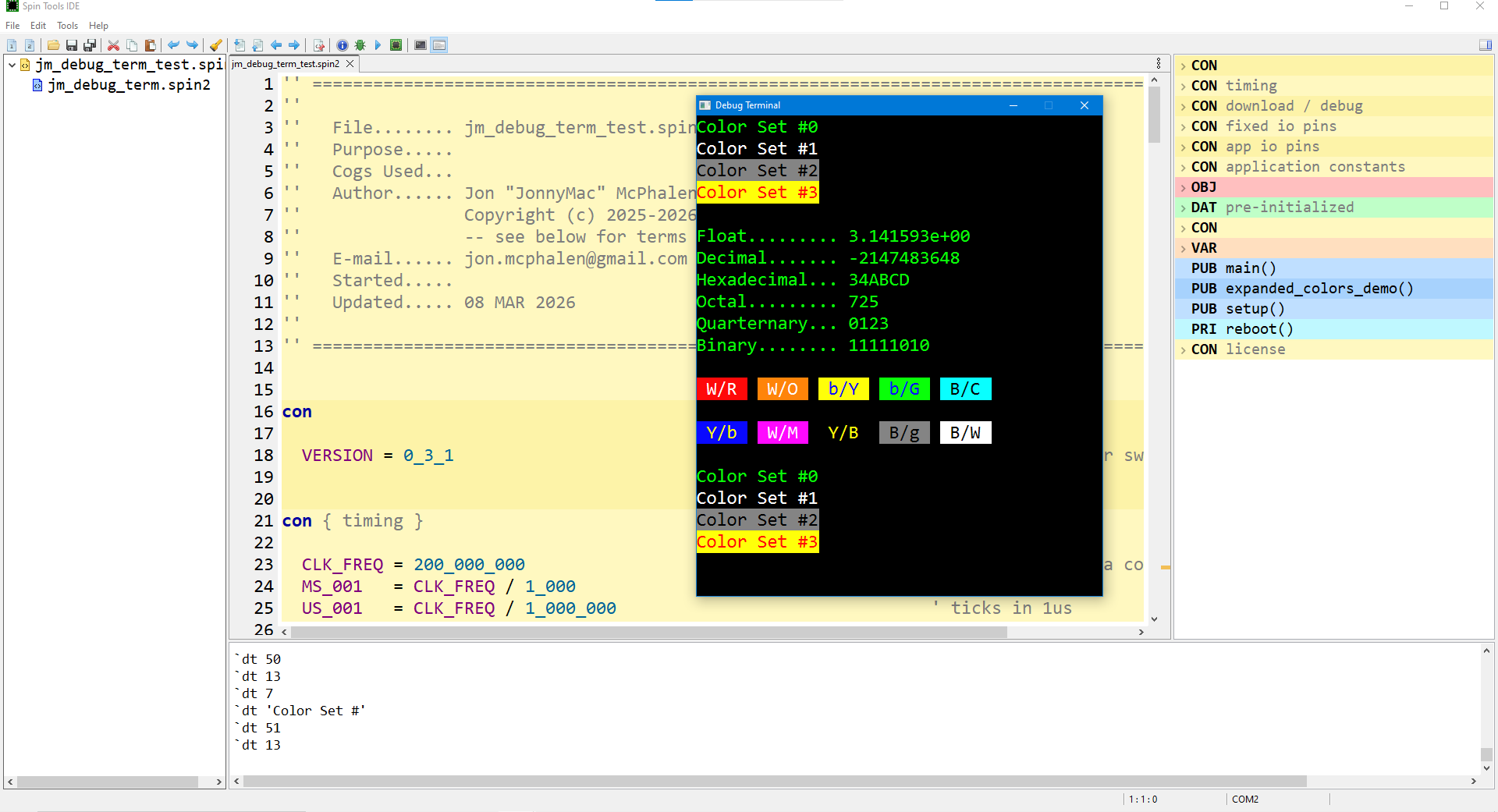 I'm going to be a little embarrassed if I didn't post this before, but I also created a serial terminal that was inspired by your earlier work. Maybe I was waiting on PNut code to come into alignment with Spin Tools which allows arbitrariy colors to be set at any time. This handles strings and sub-strings, all the normal numeric outputs (plus octal), cursor positioning, and the color stuff. Again, Ray, this was based on your initial work and some of the things I wanted having to do with colors.