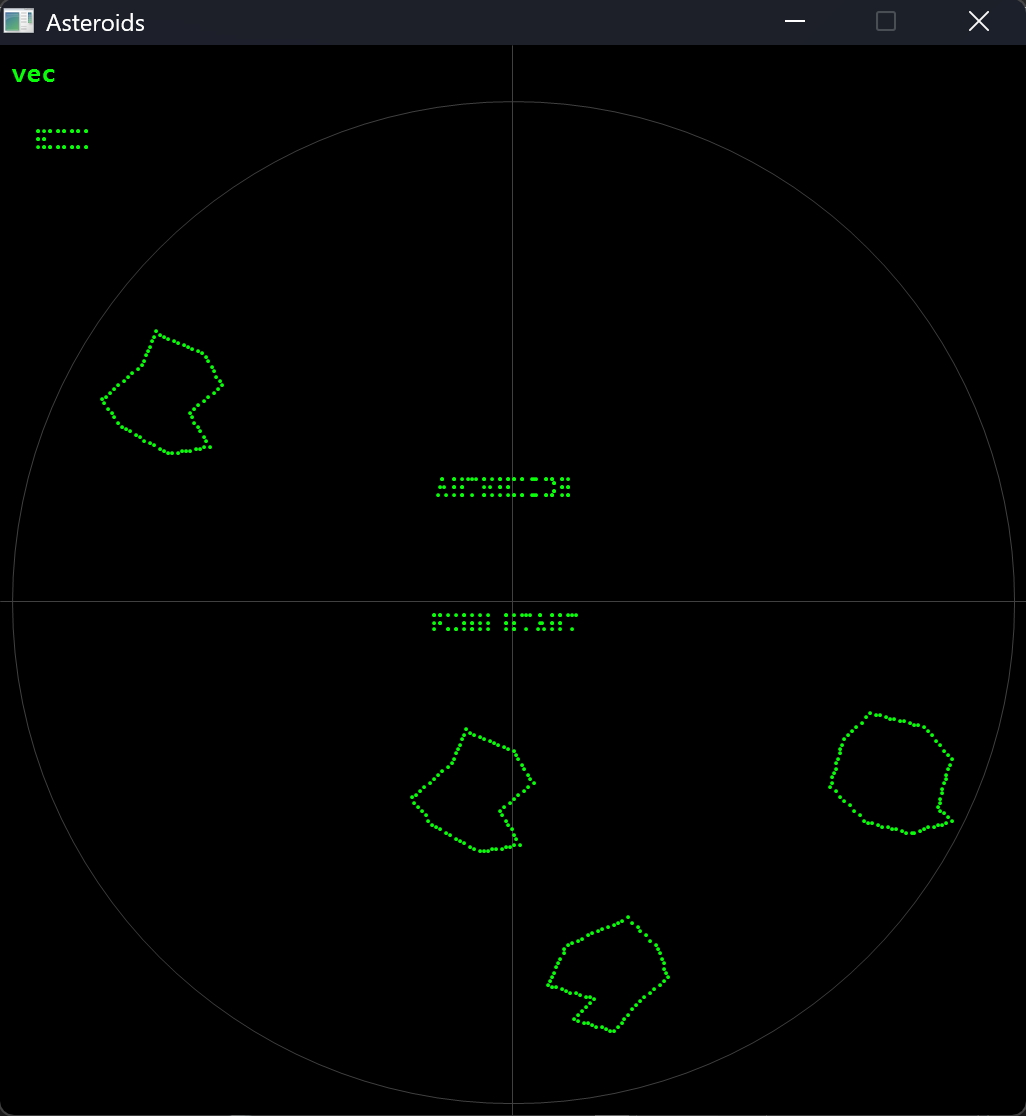 PRI send_point(x, y) ' Clip: anything outside the scope_xy display becomes the off-screen sentinel, ' which both hides the dot and breaks the vec-mode line back to the next in-range point. if x < -DISPLAY_BOUND OR x > DISPLAY_BOUND OR y < -DISPLAY_BOUND OR y > DISPLAY_BOUND x := OFFSCREEN_X y := OFFSCREEN_Y debug(`Asteroids `(x, y)) points_sent++ PRI read_inputs() in_left := pinr(PIN_ROT_LEFT) ^ 1 in_right := pinr(PIN_ROT_RIGHT) ^ 1 in_thrust := pinr(PIN_THRUST) ^ 1 in_fire := pinr(PIN_FIRE) ^ 1 in_hyper := pinr(PIN_HYPER) ^ 1 in_start := pinr(PIN_START) ^ 1Imagined it drawing vectors instead of dots, but maybe that’s how the real hardware worked?