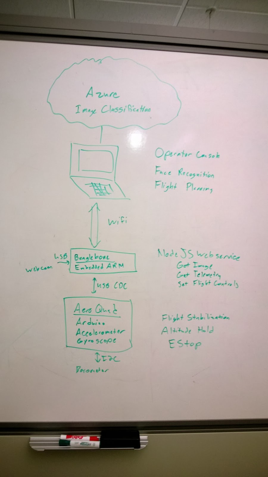 Jay, Andres and Mark work on getting the BeagleBone (a Raspberry Pi like computer) up and running with Ubuntu Linux. The BeagleBone will, among other things, run a NodeJS webservice enabling wi-fi transmission of telemetry data and the pictures and video taken by the drone's onboard cameras to the mission computer / laptop. See below for a whiteboard systems diagram...
