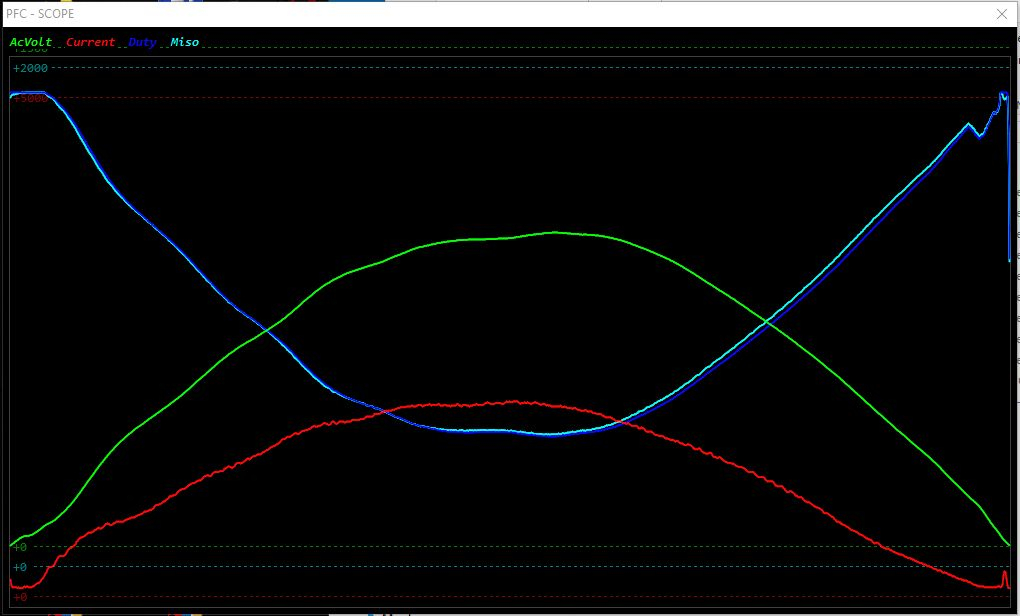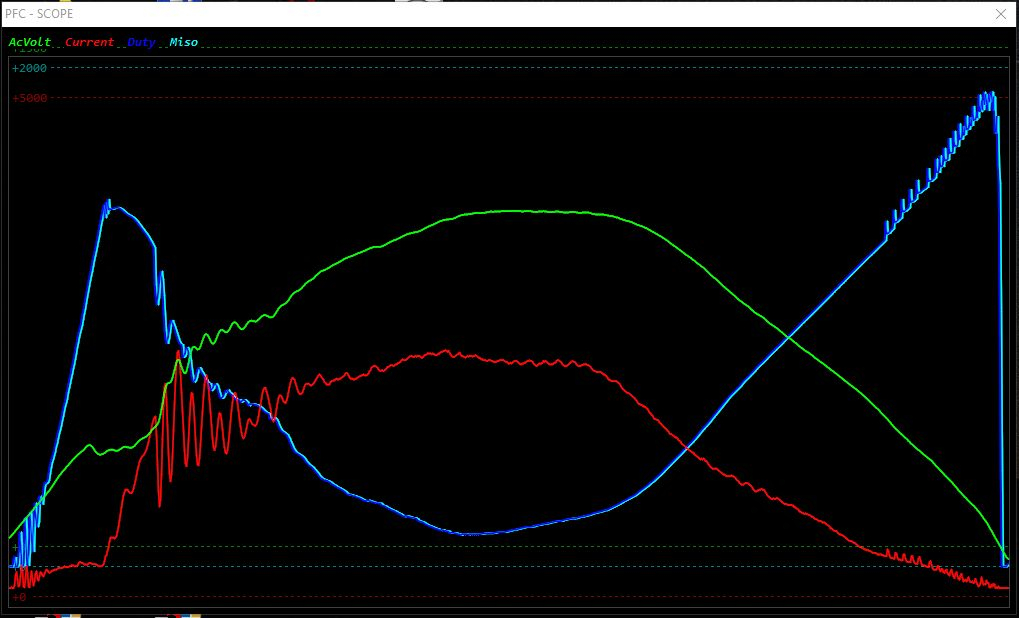 Green = AC input voltage, red = current, blue = PWM duty cycle