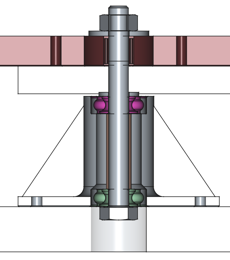 The design of the bearing units is similar to the bearing of a motor cycle rear wheel. Two ball bearings 608ZZ 8x22x7mm are used. They have a press fit in the bearing chair at their outer diameter D.design=21,9mm. At the inner diameter they have a looser fit on the axle. Partly I used some adhesive tape "to shim" the diameter. The axle is a bolt M8x80 and the bearings are held apart with a sleeve, so a nut can be tightened to press the parts together on the axle. So the bearings have no play on the axle. You can feel no play in the setup.