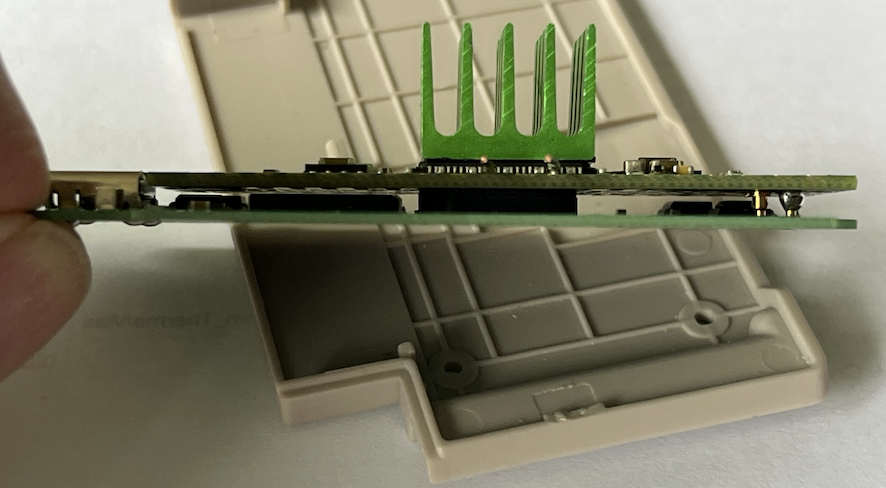 Existing cartridge shell looks like this inside. There's probably a 2-3 mm gap above the components on Lachlan's P2 board to the back surface, so enough room for a custom metal plate. It could also go though to the outside of the plastic at the back with fins in the worst case. But ideally it could retain the same external size for a cleaner look.