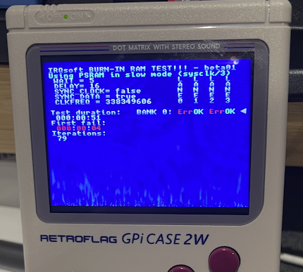 @Wuerfel_21 I have ported your emulators to my updated HW and ran into some issue after loading screen. Screen changes and freezes and looks like this once MSLug gets loaded. I tried with 4 bit SD initially then backed off to original SPI mode but effect is the same. Using PSRAM timing same as edge but also tweaked up and down a few clocks without help.