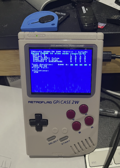 Our external power feed resistor has now been cut and it runs the SD card test from inside the GPi case on it's internal Lipo powered 5V supply, with USB-C plugged directly into the cartridge. No more external supply shorting risk.