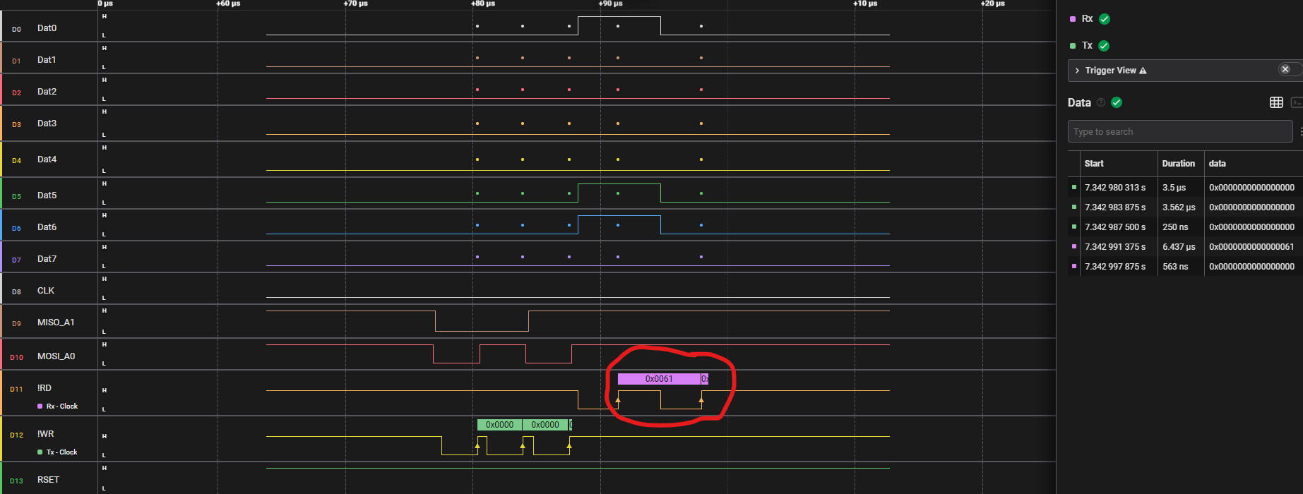 ' ID Chip W6100.readreg(W6100.REG_CIDR0,W6100.IDM_BSR_Common_Register,2,@CHIPID) debug("Chip Identification: ", uhex_(CHIPID[0])," ",uhex_(CHIPID[1])) if CHIPID[0] == $61 and CHIPID[1] == $00 debug("Wiznet W6100 detected") else debug("Error: Wiznet W6100 NOT detected.") if CHIPID[0] == $FF and CHIPID[1] == $FF and W6100.isspimode() == true debug("Did you forget to remove J1 for SPI mode?") if CHIPID[0] == $00 and CHIPID[1] == $00 and W6100.isspimode() == false debug("Did you forget to add J1 for Parallel mode?") abortAt this point I see 3 zeros sent to 0,1,and 2 (Addresses via A0 and A1) the W6100, and then a read of $61, $00 from the W6100. This should be perfect..