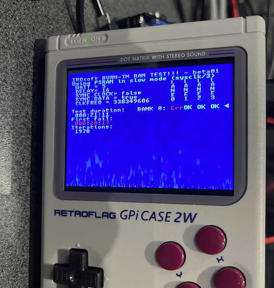 @Wuerfel_21 I have ported your emulators to my updated HW and ran into some issue after loading screen. Screen changes and freezes and looks like this once MSLug gets loaded. I tried with 4 bit SD initially then backed off to original SPI mode but effect is the same. Using PSRAM timing same as edge but also tweaked up and down a few clocks without help.
