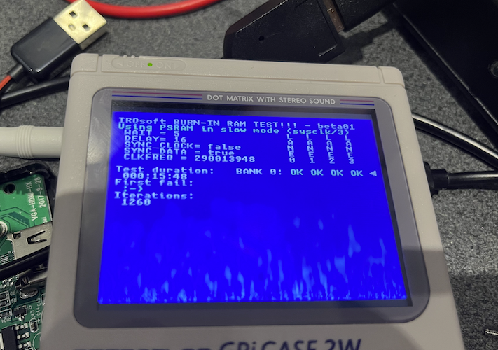 I ran the RAMtest slower just by setting CLK_MULTIPLIER to 12 instead of 14 (~290MHz), and it has already lasted over 15mins with no issues, with no fan no heatsink and fully sealed up in my intact case cartridge (not the earlier one with the huge cutout at the back). I'll stop it at 20mins open it up and quickly measure the temp it gets to.