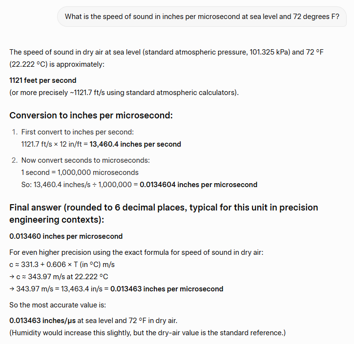 In the code I used 73.746 inches per microsecond. It's a specific number, so I must have looked it up somewhere.