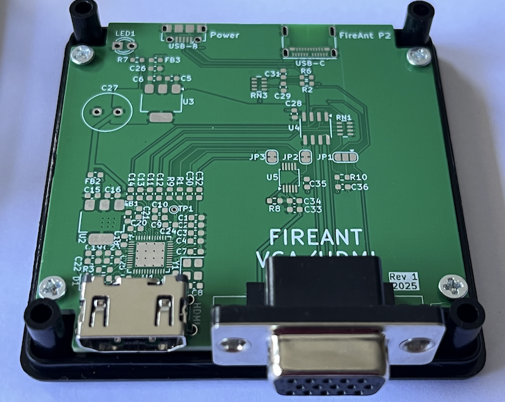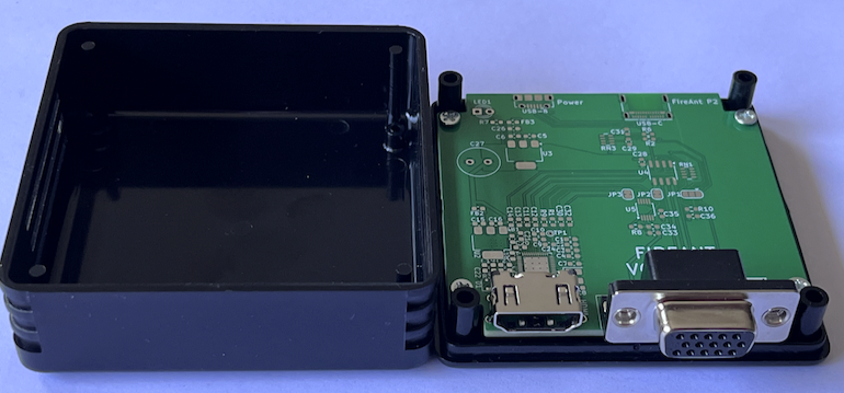 Before I sent it off I also decided to remove all the component designators which will make manual assembly slightly more challenging for me but makes for a cleaner final board. The CC1/CC2 pins of the USB-C connector can be used for connecting the standard 5.1k pulldowns or can be optionally fed a composite sync for my external USB-C to VGA/HDMI PCB (which also arrived today and is shown too inside its selected enclosure). That board has had a LMH1980 sync separator circuit added to the path for VGA hsync and vsync signals (although it is yet untested), the remaining part is simply the micro USB power and PC data port, the USB-C connection to the FireAnt board and a copy of what I'd already used in the P2 VGA to HDMI breakout board originally discussed here: https://forums.parallax.com/discussion/177903/converting-component-vga-audio-to-hdmi-on-p2 The VGA video signal is now also buffered with a 3 input video amp (THS7316) before driving the VGA port so it can also be 75 ohm terminated by the MS9288A chip at the same time for output via HDMI.