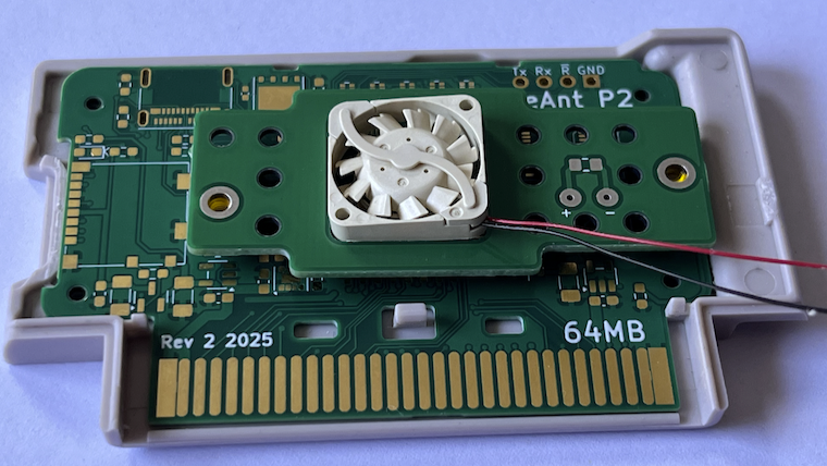 As part of the last PCB order, and to try to assist with potential thermal issues I also included a small 1mm thick fan board that sits above the FireAnt and can contain a 15x15mm fan in a cutout. 5V power get supplied through the solder nuts with series resistors on the FireAnt's PCB to these terminals to drop the voltage to 3V if needed and also protect against direct shorts. I drilled some holes for some more airflow above the PSRAMs which are otherwise covered by this board. So this is not intended as a heatsink just a mounting bracket designed to help circulate the hot air inside the case and blow over the P2 to cool it more. We'll see how well it all goes on the rev 2 board with 6 layers. I threw a cap in parallel with the fan wires to try to reduce noise spikes. Maybe I've created one nice inductive loop or something from this circuit, LOL. It's only 30mA though.