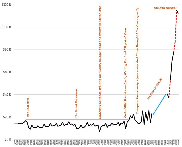 PPS: Here's a graph of quarterly money already spent on just the servers that go in these data centres. A six fold increase in an already mature market is completely stupid! And possibly what's even more nuts is that "New Normal" is actually supply side limited. It would've been even higher if manufacturing was able to able to keep up.