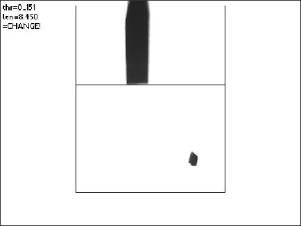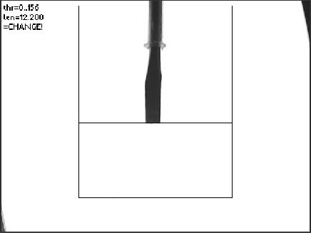 def find_tip_solid(img): global threshold # Run solid area detection on a copy of the ROI r = img.copy(roi=ROI) hist = r.get_histogram() threshold = (0, hist.get_threshold().value()) # Otsu's method r.binary([threshold]) # convert to black/white using threshold x0, y0, w, h = ROI for j in range(h - 1, -1, -1): row_stat = r.get_statistics(roi=(0, j, w, 1)) if row_stat.l_mean() > 10: return y0 + j return NoneMy biggest problem was to try to make up python code by trial and error. I thought this was easy because of the syntax highlighting editor of the IDE spotting every mistake I make. But it wasn't. The python interpreter crashes without warning if I pass parameters to a library function of which the data type doesn't match the expectations. The parser of the editor can't warn because it has no idea of data type until the code is executed.