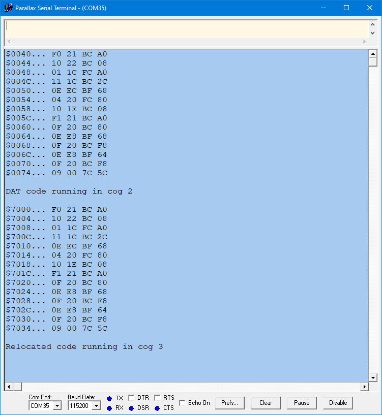 • Yes, I could copy to a specific location, but how? In Spin, I can't provide a hexadecimal address using Longmove? And how can I know the length of the compiled DAT file? And how can I avoid writing to the Spin code that's currently executing, since I don't know its address either?