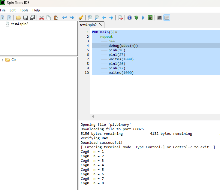 CON _clkmode = xtal1 + pll16x _clkfreq = 80_000_000 PUB Main()|n repeat n++ debug(udec(n)) debug(udec(cnt)) _pinh(26) _pinl(27) _waitms(1000) _pinl(26) _pinh(27) _waitms(1000)But, debug doesn't seem to work except at 80 MHz. Guess that means it was already defaulting to 80 MHz...