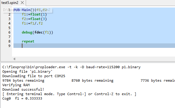 The second tool (alt+2) is rigged to load P1 with the generated p1.binary file from first tool (using proploader.exe): -t -k -D baud-rate=115200 p1.binary
