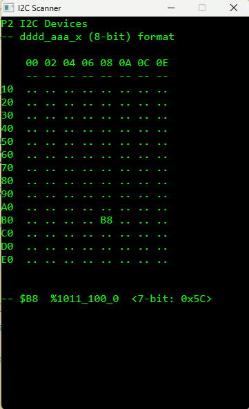 Was working on adapting an @JonnyMac debug I2C scanner to work on both P1 and P2 in Spin2...