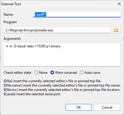 So the first external tool (activated by alt+1 on keyboard) is rigged to compile for P1 (using flexspin.exe): -1 -O2 -g -D_BAUD=115200 -L C:\flexprop\include -o p1.binary ${file}