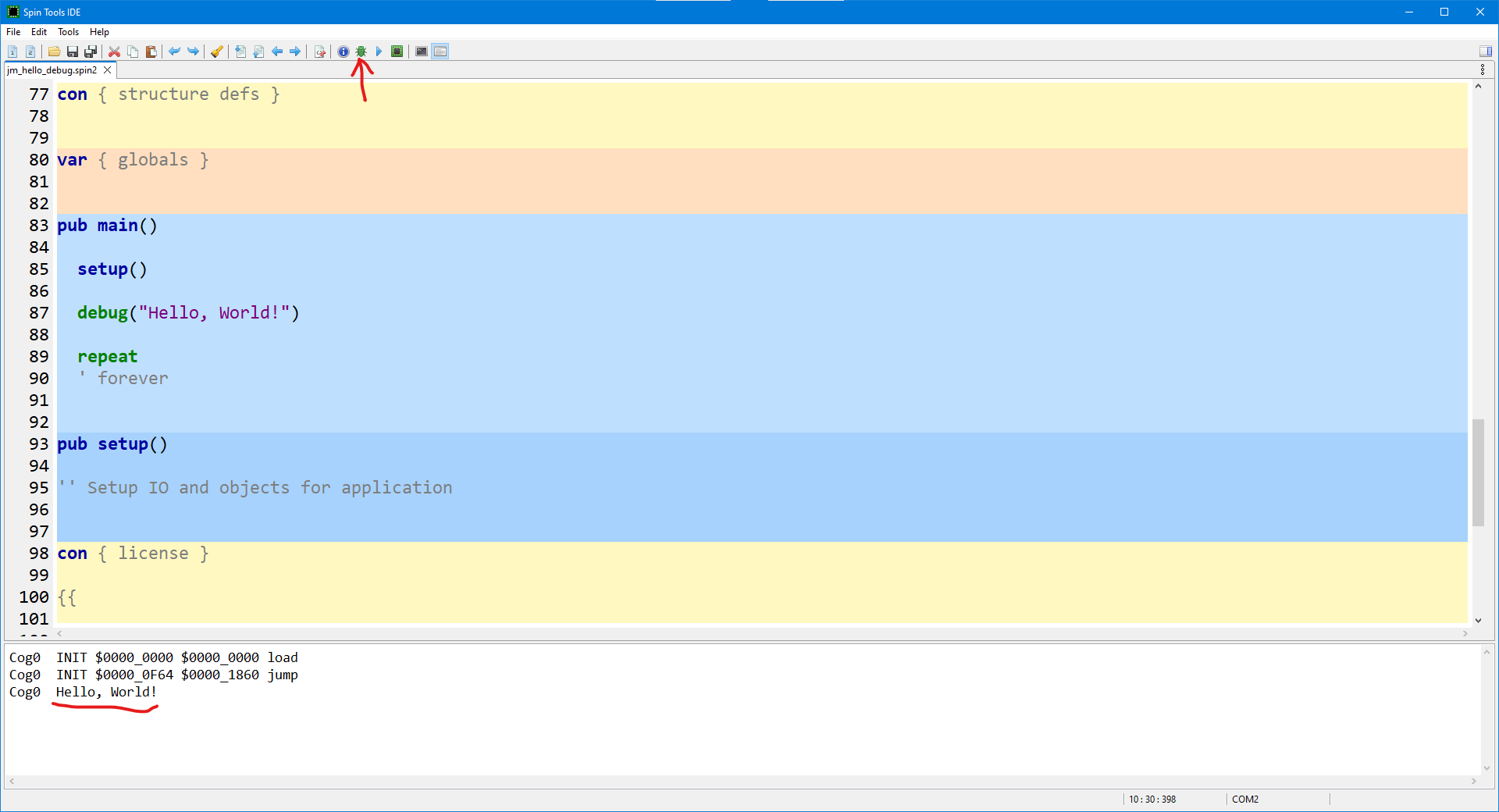 As Ray points out, there is a different toolbar icon for the P2 debug windows. For simple strings, P2 debug is easy. For more complex outputs, P2 debug commands can be tricky. You've been warned. In Spin Tools, basic debug information is output to a console pane under the bottom of the edit window. This debug output can also be logged to a file.