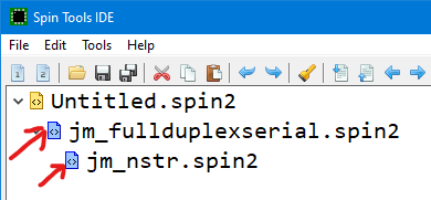 Move jm_fullduplexserial.spin2 and jm_nstr.spin2 to the P2 library folder and try again. You should see a blue icon next to the name in the Object Browser (if you have it open -- and this is a good reason on why).