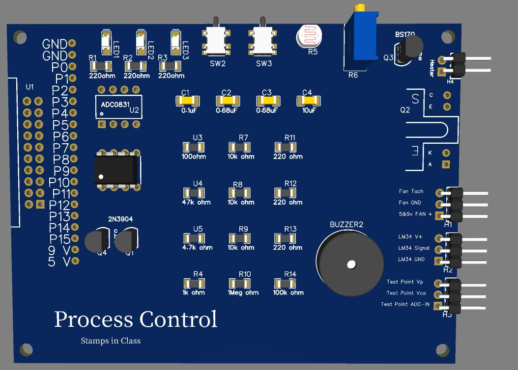 Industrial Control / Process Control has always been the best book in the Stamps in Class series in my opinion. I decided to make a PCB based on the exercises in the book. Here is the first one. I'm still working