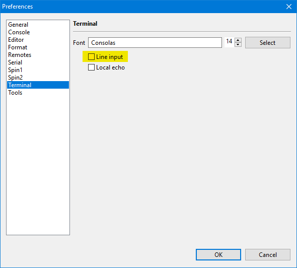 Note, too, that when using Spin Tools the terminal should not be set to line input. Again, the program was coded more than five years ago when all we had was PST and they way it handles input. If there is a white text input box at the top of the Spin Tools terminal, you're in line input mode. Turn this off in the preferences.
