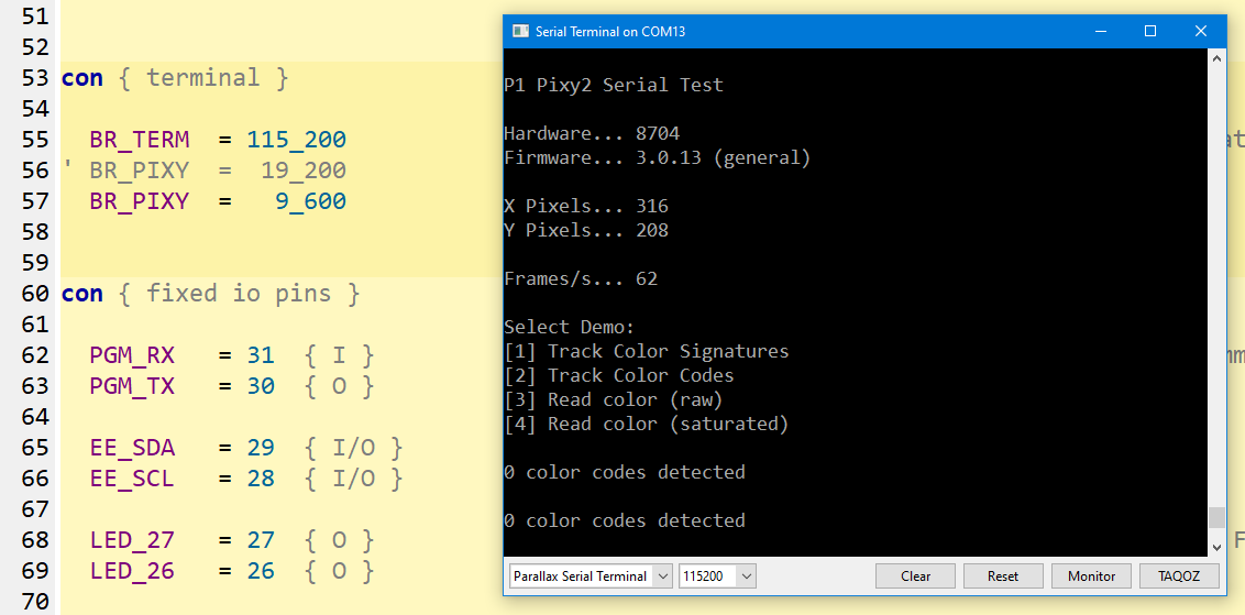 115200 won't work with the P1 version of the code because the serial is done in Spin1 so it's limited to 19200. I did a quick try at 9600 baud and that works fine. Remember, you have to use PixyMon to set the Pixy2 baud rate to 9600.