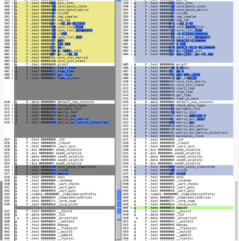 Also, coremark results are generally expressed as floating point - it is not clear from the output whether they are being truncated to integers during the calculation or during the printing, but either one will skew the results and also make it difficult to compare code sizes, since omitting floating point will generate smaller code.