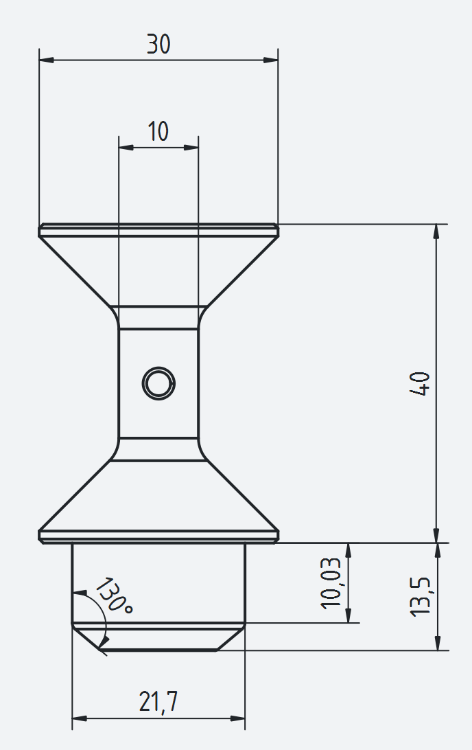 Second difficulty was to find the right shape of the chamfer at the lower end of the bobbin. When the bobbin is put down onto the carousel, it's position shall be realigned. The chamfer leads it then. The picture shows the bobbin. The carousel plate is 12mm thick. The chamfer of the bobbin is also sanded for low friction. The chamfer must allow sufficient variance of position, must not stick when the bobbin is put down and the length of the cylinder must not be reduced too much. Under the carousel there is the belt drive wich must not collide.