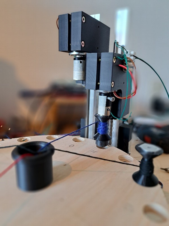 The braiding point is now elevated from the carousel plate, which decreases variation of tension. The tensioning motor is not used. Yarn tension is so low, that the motor is not moved, even with no motor current at all.