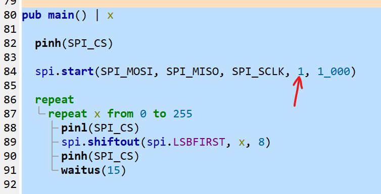It seems to, even when compiled by FlexProp. I'm really confused about the logic analyzer: When running the smart pin SPI it sees the 1MHz SPI clock with no problem but the MOSI data is a mess. I though that the LA is doing 8-bit parallel samples at the specified rate and the protocol analyzer sorts things out after, but the MOSI capture is fouled. I even tried reversing the order of the pins but that made no difference.