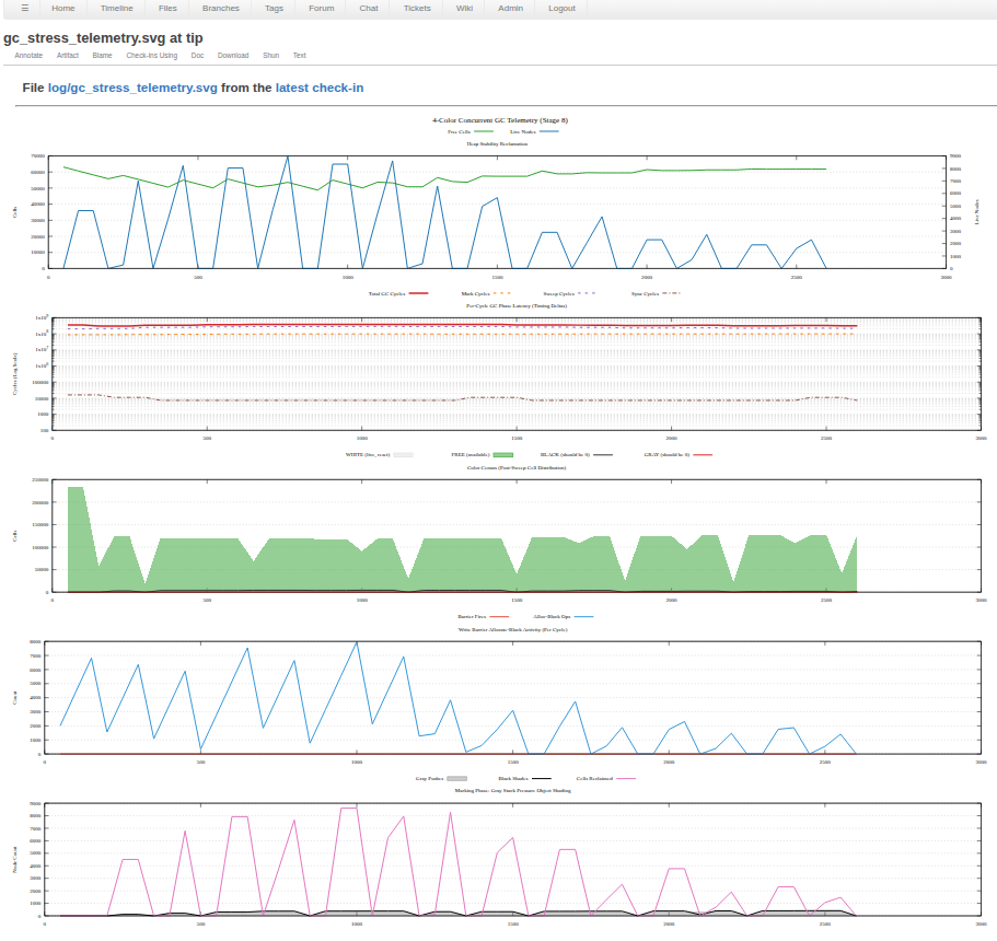 in my Fossil version control repository I am watching the changing plots to see, in this case, when I go from a garbage garbage collector to a working garbage collector on my Lisp system using P2 XBYTE bytecode processor.