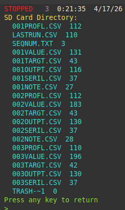 SD:(unmounted)> help Dual FS Shell v1.0.0 Device/Mount Navigation Files ------------------------- ------------------------- ------------------------- dvc {sd|fl} Switch dir List (ls) type <file> Show (cat) mount [sd|fl|all] Mount tree [<path>] Dir tree hexdump <file> Hex (hd) unmount [sd|fl] Eject cd [<path>] Change dir copy <s> <d> Copy (cp) stats FS stats pwd Show dir del <file> Delete (rm) card Card (SD) mkdir <dir> Create dir ren <old> <new> Rename version Driver rmdir <dir> Remove dir move <s> <d> Move (mv) label [<name>] Vol label audit Check FS touch <file> Create cls Clear fsck Repair FS demo Demo files alias Aliases bench Throughput format [sd|fl] date [y m d h m s] Set/show date/time help This helpMight consider some horizontal separation, or maybe vertical separation with return for "more". Or something...