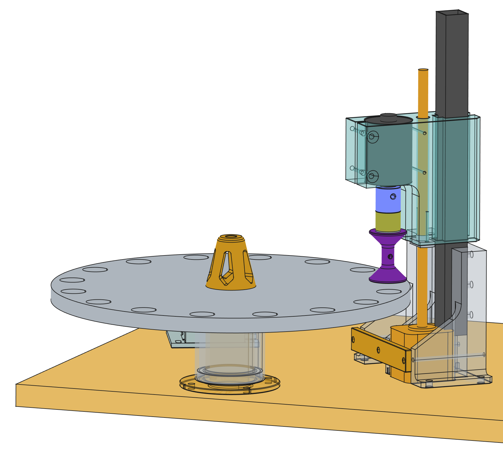 The plate with the holding places for the bobbins will rotate and therefore I will call it carousel. A pickup-spindle can grab the bobbin with an electromagnet, has the ability to rotate the bobbin to tighten the yarn and can lift the bobbin.